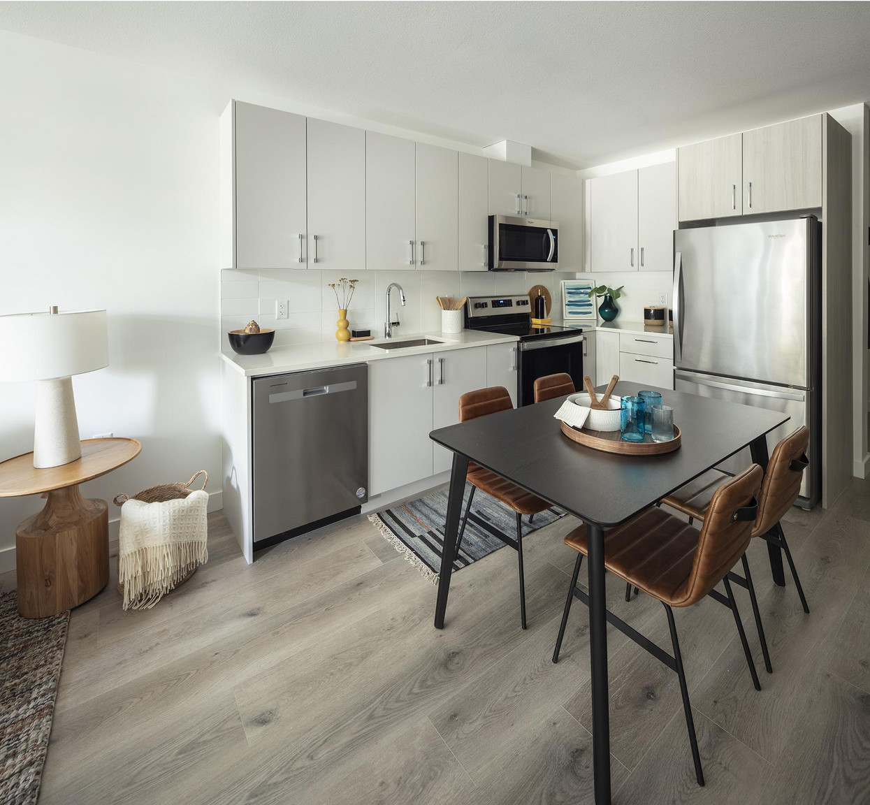 Each suite includes premium features such as a gourmet kitchen with a stainless steel appliance package, full size in-suite laundry and internet/cable readiness, providing modern living essentials.